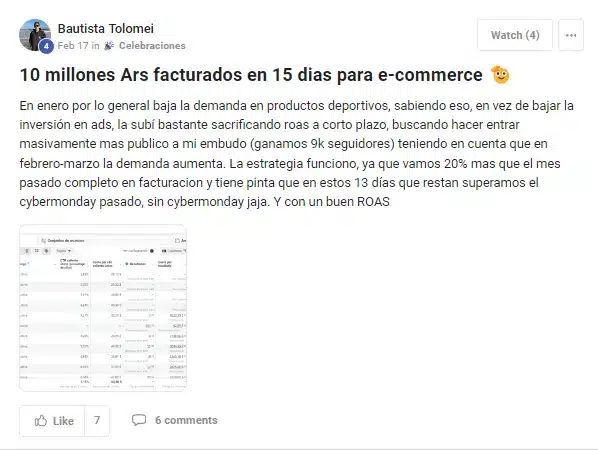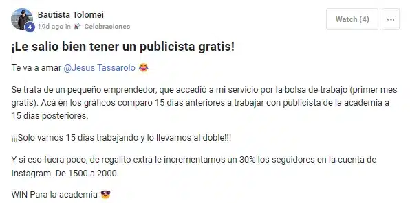 Pero mira lo que pasó en 15 días cuando Bauti decidió aplicar lo que aprendió en “Academia de Publicistas” con un cliente que le asignamos…